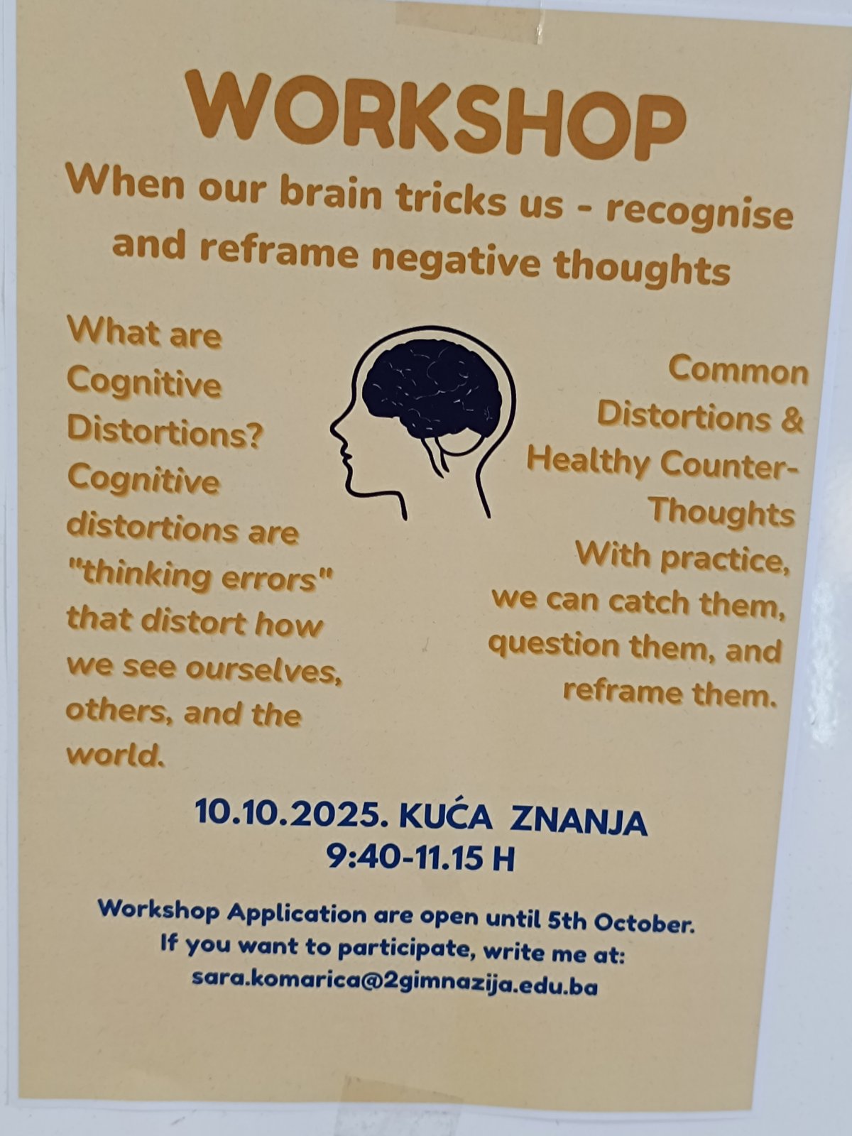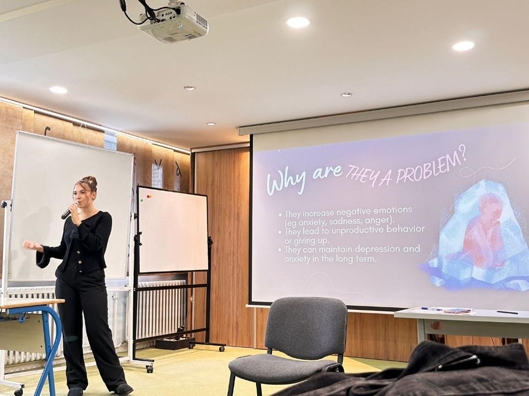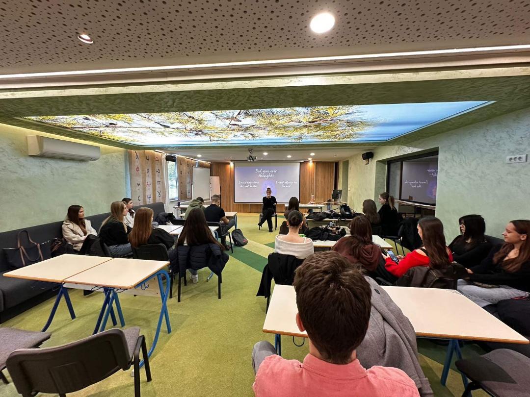 • Učenica IV3 IB Sara Komarica održala je interaktivnu radionicu pod nazivom “When our brain tricks us – recognize and reframe negative thoughts”, u kojoj su učesnici imali priliku naučiti kako prepoznati i preoblikovati negativne misli.