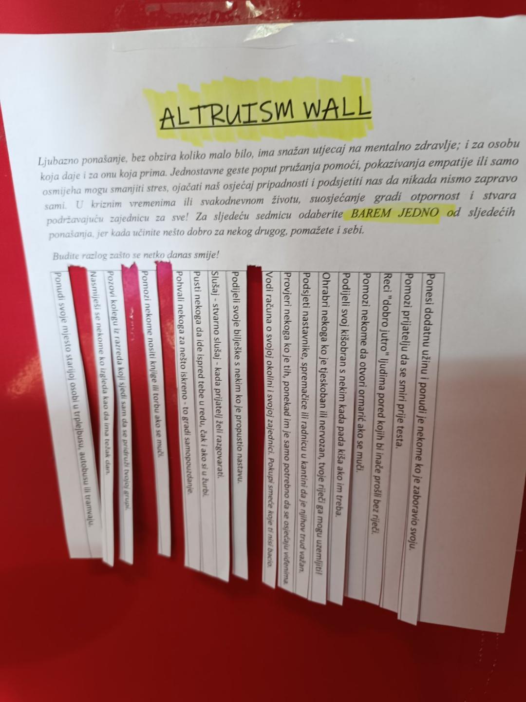 • Program je obuhvatio i “Potragu za blagom” u skladu sa ovogodišnjom temom obilježavanja Međunarodnog dana mentalnog zdravlja „Pristup uslugama – mentalno zdravlje u katastrofama i hitnim situacijama” kada su učenici u školi rješavali enigme i pronalazili dijelove opreme za prvu pomoć. U školi je na više mjesta postavljen i “Zid altruizma” sa kojeg su učenici mogli preuzeti ideju - dobro djelo za zajednicu. Obje aktivnosti je osmislila učenica IV1 IB Lana Kulenović uz superviziju profesorice psihologije Sandre Muratović.