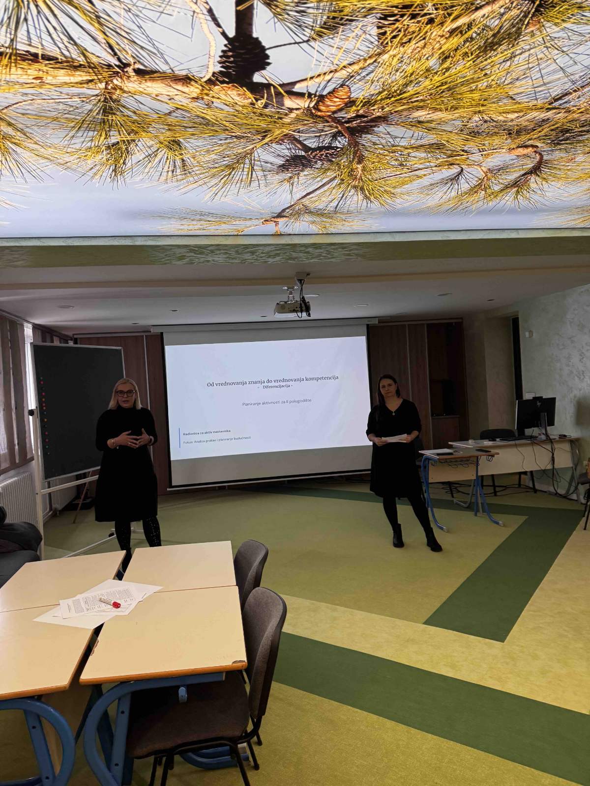 U četvrtak, 15. januara 2026. godine, održana je radionica na temu „Od vrednovanja znanja do vrednovanja kompetencija“, s posebnim fokusom na razvoj kompetencija kod učenika i primjenu diferencijacije u planiranju nastavnih aktivnosti za naredno polugodište. Radionica je bila namijenjena članovima aktiva bosanskog i engleskog jezika.